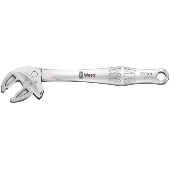 Wera 6004 Joker S selvjusterende nøgleWera 6004 selvjusterende universalnøgle med skraldefunktion, til møtrikker med nøglevidder 10-13 (metrisk) og 7/16"-1/2" (tommemål). Gaffelside indstillelig i størrelse, paralleltførte glatte bakker; med 30° returvinkel via hjørneviddeprismer i gaflen; hul til ophængning.
