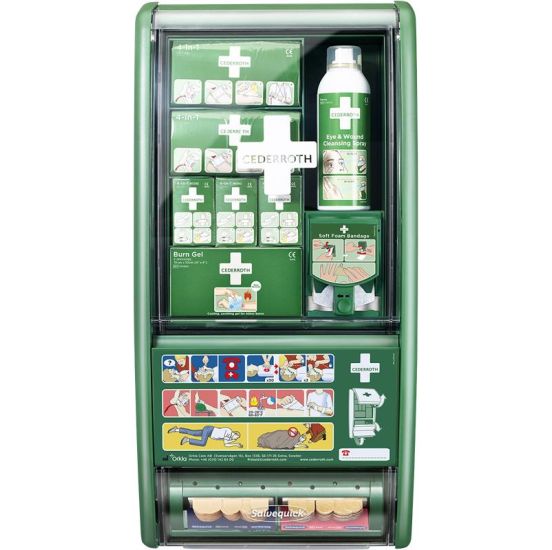 Cederroth First Aid Station indeholder produkter til håndtering af flere typer skader og kan desuden nemt tilpasses til forskellige plejebehov.