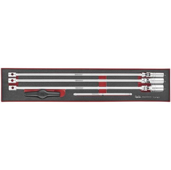 Teng Tools tændrørstopsæt med 5 dele med ekstra lange leddelte tændrørstoppe med 3/8" □-fatning og hul til brug sammen med T-håndtag samt drejestift. Toppene ligger i EVA-skum i tre forskelligt farvede lag.