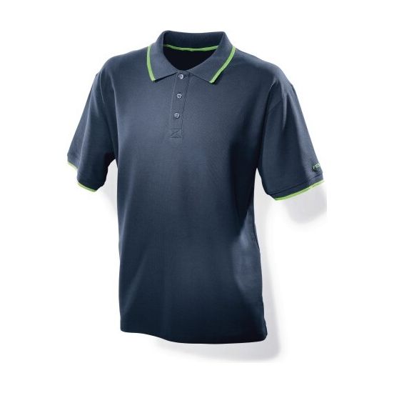 Klassisk mørkeblå poloshirt fra Festool med 3 knapper i halsen. Farve: mørkeblåMateriale: 100% bomuld, kæmmetGrøn farvestribe på rib-krave og rib-ærmesømKvalitets-Japanprint af Festool-logoet på venstre ærme Sideslidser i livet Sølvfarvet pynteprint (3 Festool-maskiner) på venstre krave
