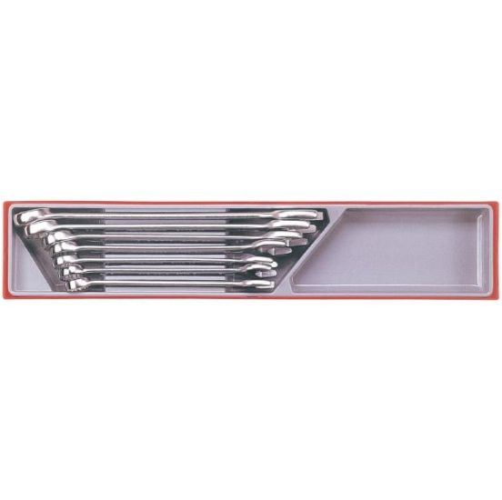 Teng Tools ringgaffelnøglesæt med 7 ring-gaffelnøgler i millimeter-størrelser. Af kromvanadiumstål. Samme dimension i begge ender. Det tolvkantede ringhoved er bukket i en vinkel på 15°. Slebne hoveder. Forkromede.