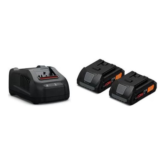 Batteristartsæt GBA 18 V 5.0 Ah AS. 2 li-ion-batterier med hurtiglader GAL 1880 CV Korte ladetider takket være en høj ladestrøm på 8 ampere, aktiv luftkøling og procestyret opladning. Brugervenlig og pladsbesparende takket være anordningen til opviklin