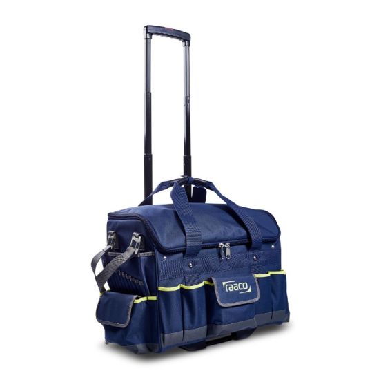 Trolley med fastmonteret værktøjstaske. Tasken er fremstillet af slidstærkt polyester og indeholder ind- og udvendige lommer/værktøjsholdere. Det store indvendige rum er opdelt ved hjælp af en flytbar skillevæg og påsat velcro i siderne til montering af ToolFix (ekstra tilbehør). Værktøj medfølger ikke.
