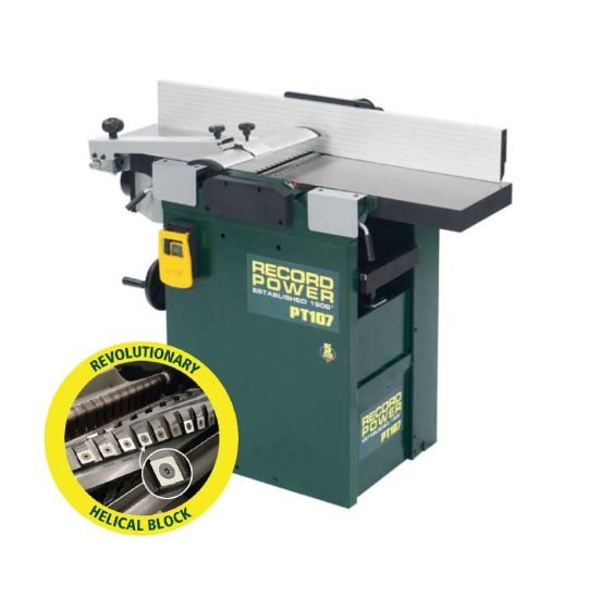 Denne afretter/tykkelseshøvl fra Record Power er perfekt egnet til den kræsne træarbejder, der forventer professionel, pålidelig ydeevne fra en solid og holdbar maskine, men ikke har plads eller budget til en større industrimaskine.I hjertet af denne maskine er den spiralformede skæreblok. Den har 44 TCT skærehoveder arrangeret i et spiralformet format over fire rækker. Selve knivene er bearbejdet til en konveks profil for at opnå et forskydningssnit, hvilket resulterer i en finish af ekstrem høj kvalitet på træet. Denne skæremetode er ekstremt effektiv og reducerer strømforbruget og belastningen på maskinen sammenlignet med den traditionelle 3-knivs skæreblokhøvltykkelse. Arrangementet af skæreblokkene giver også mulighed for øget luftstrøm mellem knivene, hvilket sikrer, at luften udsuges fra maskinen effektivt, hvilket i høj grad reducerer driftsstøjen med op til 50 % i forhold til traditionelle maskiner.Den spiralformede blok skaber små, jævnt store spåner, hvilket betyder, at der opnås mere effektiv udsugning, hvilket yderligere øger driftseffektiviteten af denne maskine. TCT-klingerne holder 10-20 gange længere end traditionelle HSS-høvlknive, og hver skæreblok har fire sider, så når knivene bliver stumpe, skal du blot dreje dem for at afsløre en frisk skærekant. Sammenlignet med en traditionel 3-knivsmaskine er klingeskift og opsætning enkel og nem, da hver skæreblok er fastgjort til blokken i en fast position - hvilket betyder, at ingen komplicerede opsætningsoperationer er nødvendige.Kraftige støbejernsborde giver denne maskine en grad af nøjagtighed, der ikke findes andre steder på maskiner med denne kapacitet eller prisklasse - indføringsbordet justeres nemt og præcist ved hjælp af det robuste håndtag og klare dybdeskala. Derudover kan PT107 også prale af en udløbsbordjusteringsfacilitet, hvilket betyder, at der kan opnås virkelig nøjagtig kalibrering for at sikre overlegen nøjagtighed ved høvling.For nem og hurtig konvertering til tykkelsestilstand er emhætten et stort svingende design i et stykke stål. Tykkelsesbordet er understøttet af en væsentlig central søjle, der giver masser af støtte til selv de tungeste emner. For at hjælpe med tykkelsen af særligt vanskeligt papir, er der tilvejebragt en kobling på tykkelsestilførslen for at tillade fjernelse af papir, hvis der opstår fastklemning. Dette betyder også, at tykkelsen kan deaktiveres, når den ikke er i brug for at spare slid på indvendige dele.Tekniske dataTykkelse tilførselshastighed: 5 meter/minutKutterblok Diameter:75 mmMaksimal tykkelseshøjde: 190 mmMaksimal tykkelsesbredde: 265 mmMaksimal tykkelse af skæredybde: 2 mmMaksimal høvlebredde: 265 mmMaksimal høvldybde: 3 mmHøvlebord Længde:1110 mmMotorindgang P1:2,2 kWMotorydelse P2:1,69 kWSpænding: 230VVægt: 162 kgStørrelse:H950 x B710 x D 1110 mm