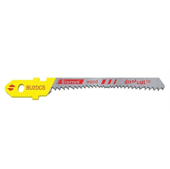 Starrett Stiksavsklinge Dualcut 50mm BU2DCS. Patenterede tanddesign der skærer på op- og nedslag. Smal klinge som er yderst velegnet til fin profil savning i træ. Perfekt rent snit på begge sider af emnet.